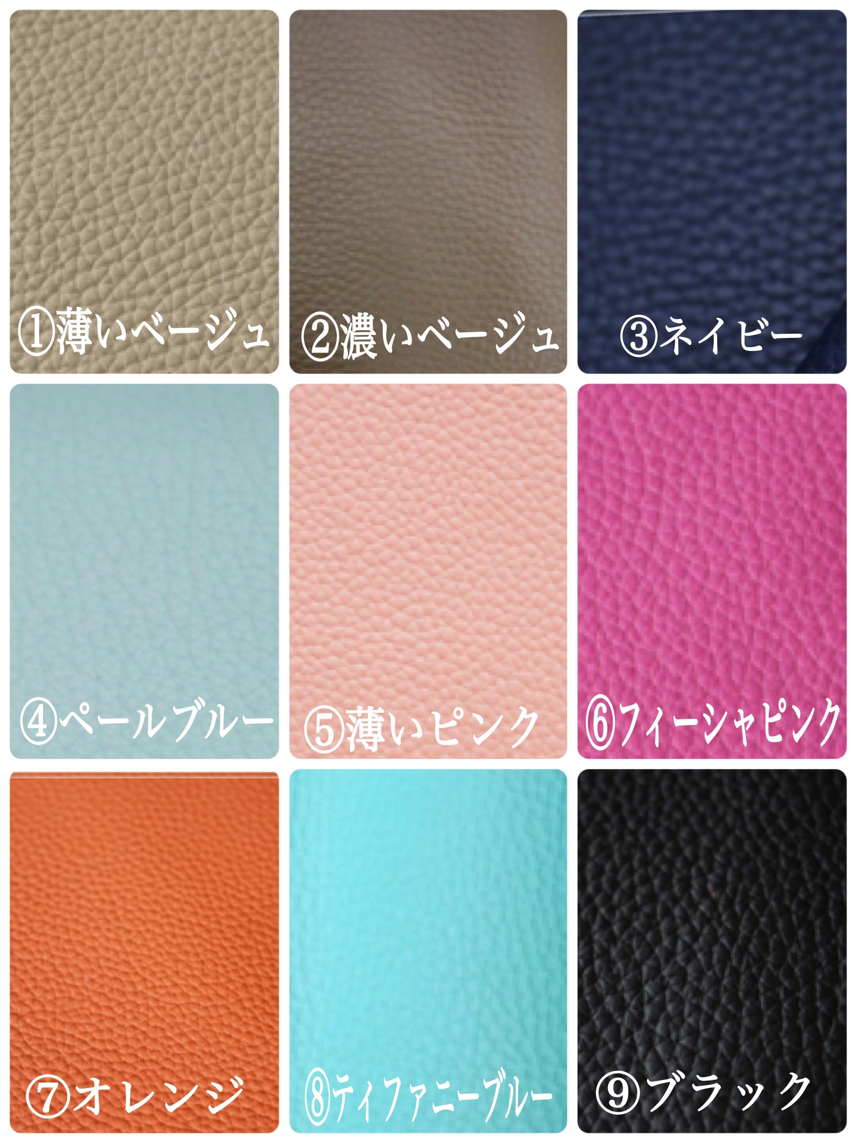 ①レザー(濃いベージュ、薄いベージュ、水色、フーシャピンク、オレンジ、黒、ネイビー、レッド、ティファニーカラーなど)